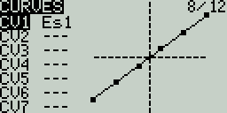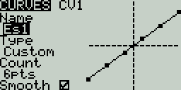 The **Curves** screen allows you to define custom curves to use in the Inputs, Mixes, or Output screens. The curves screen will show the configured custom curves, with a graphical representation of each curve.
