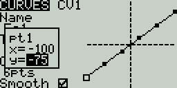 After the last configuration option (Smooth), you will automatically begin to scroll through the configured points on the curve. To change the values of the points, press the **\[Enter]** button and then adjust the values as desired. For **Standard** curves, you will only be able to adjust the Y value. For **Custom** curves, you can adjust both the X and Y values.