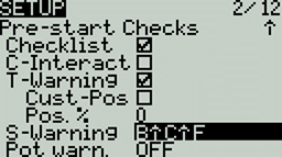 **S-Warning** - The section displays all the switches that are configured on the radio and allows you to select which position is the correct position for the switch state check. Selecting the switch will cycle through the available switch positions or turn the check off for the switch completely. A long press of **\[Enter]** while this section is highlighted will set all the switch positions to the currently configured physical positions of the switches.