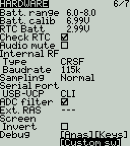 The **Hardware** screen is where you configure hardware specific-settings for your radio. It shows all physical hardware objects (sticks, pots, switches) and allows for their modifications. It is also where you can calibrate your sticks and pots. It also contains additional configuration options.