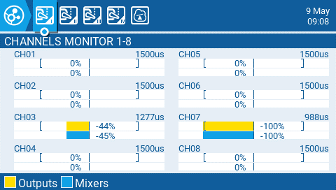 The Channel Monitor shows both the output value (top bar) and mix value (bottom bar) for each of the 32 radio channels, spread across 4 pages of 8.