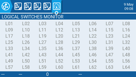 The 5th page of the channel monitor is the logical switches monitor. On this page, you will see the status (activated/non-activated) of all logical switches. Logical switches that are activated are highlighted.