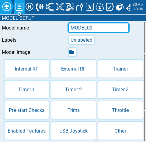The **Model Settings** screen contains all the options to configure your model. Across the top of the page you will see icons that will take you to different pages of model settings when selected. The default screen for model settings is the[model-setup](https://zkl2333.gitbook.io/edgetx-user-manual/v2.11-en/color-radios/model-settings/model-setup "mention") screen.