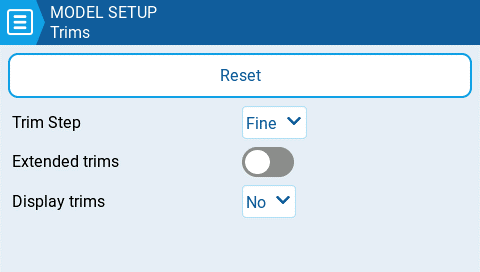 Trims are used adjust the center position of a given stick axis. EdgeTX has the following time configuration options: