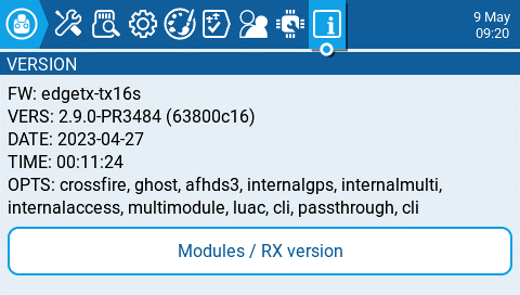 The **Modules / RX Version** gives you information about the activated RX modules for the currently selected model.
