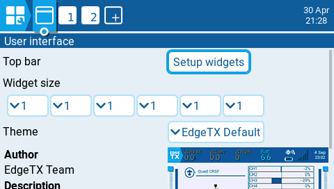 Selecting the setup widgets button will display the main view or top bar with the widget cells outlined in a hashed line. You can assign a widget to a cell by selecting the cell and then the widget you want to assign to it from the drop-down menu. After selecting the widget, it will then open the configuration options for the widget for further configuration. Widget descriptions and configuration options for widgets included with EdgeTX are below.