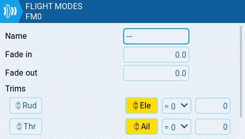 **Step 1:** Disable the trims for rudder and throttle which are not needed. Then we can reuse them for other functionality. Enter the model menu and navigate to the [Flight Modes](https://zkl2333.gitbook.io/edgetx-user-manual/v2.11-en/color-radios/model-settings/flight-modes) page. Edit **FM0** and disable the Throttle and Rudder trims. The yellow highlight color will be gone when the trims are disabled.