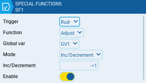 **Step 3:** We will now create 2 [Special Functions](https://zkl2333.gitbook.io/edgetx-user-manual/v2.11-en/color-radios/model-settings/special-functions) to adjust the **GV1** value we created in the previous step. Navigate to the [Special Functions](https://zkl2333.gitbook.io/edgetx-user-manual/v2.11-en/color-radios/model-settings/special-functions) page and create a new function **SF1** for decreasing **GV1**