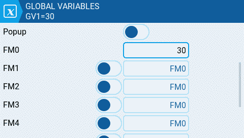 **Step 2:** Now we navigate to the [Global Variables](https://zkl2333.gitbook.io/edgetx-user-manual/v2.11-en/color-radios/model-settings/global-variables) page and set a default value of 30 for **GV1** in **FM0**